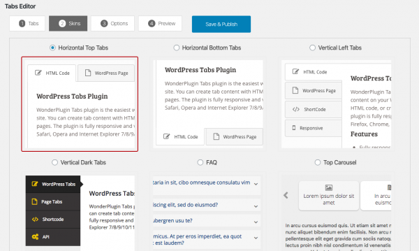 To add the final tab group to your WordPress page or post, click the "Save & Publish" button to save the tab group, copy its shortcode and paste it to the page or post editor.