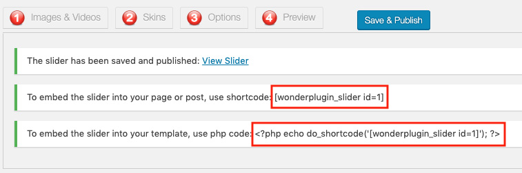 After you save and publish the slider, the plugin will display a shortcode and a php code snippet.