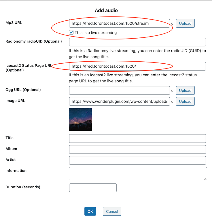 To allow the player to retrieve the current song title of the streaming, enter your Icecast2 status page URL to the "Icecast2 Status Page URL" input box.