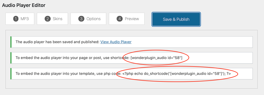 In the player editor, click the button "Save & Publish" to publish the audio player, the plugin will display the shortcode and the PHP code snippet of the player.