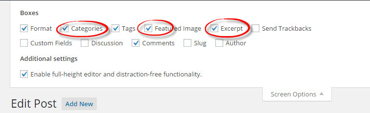 In the post editor, click the Screen Options tab on the top right, check the options of Categories, Featured Image and Excerpt.