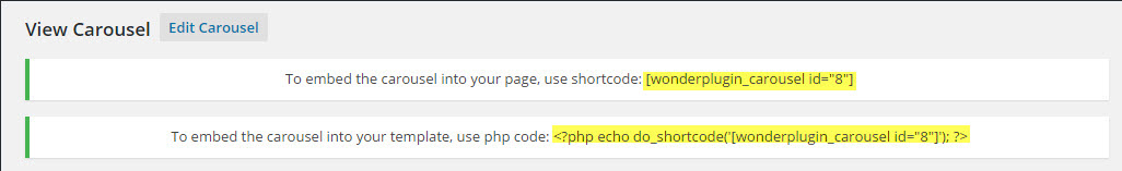To add the carousel to a post or page, copy the shortcode and paste it to the page content.