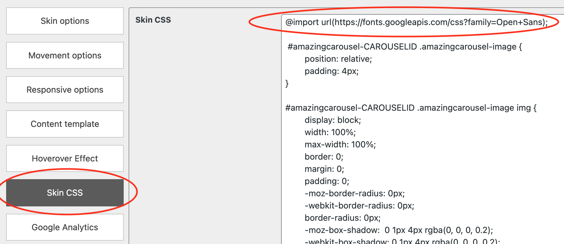 Wonder 3D Carousel, Wonder Carousel, Wonder Audio Player and Wonder Tabs: In the Wonder plugin, edit the carousel/audio player/tab, in step 3 Options tab, Skin CSS, remove the following line from the Skin CSS input box.