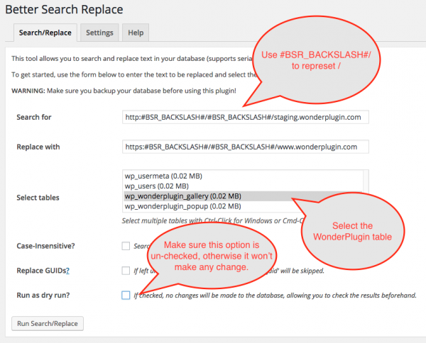 For example, if you would like to replace http://staging.wonderplugin.com with https://www.wonderplugin.com. You need to find:
