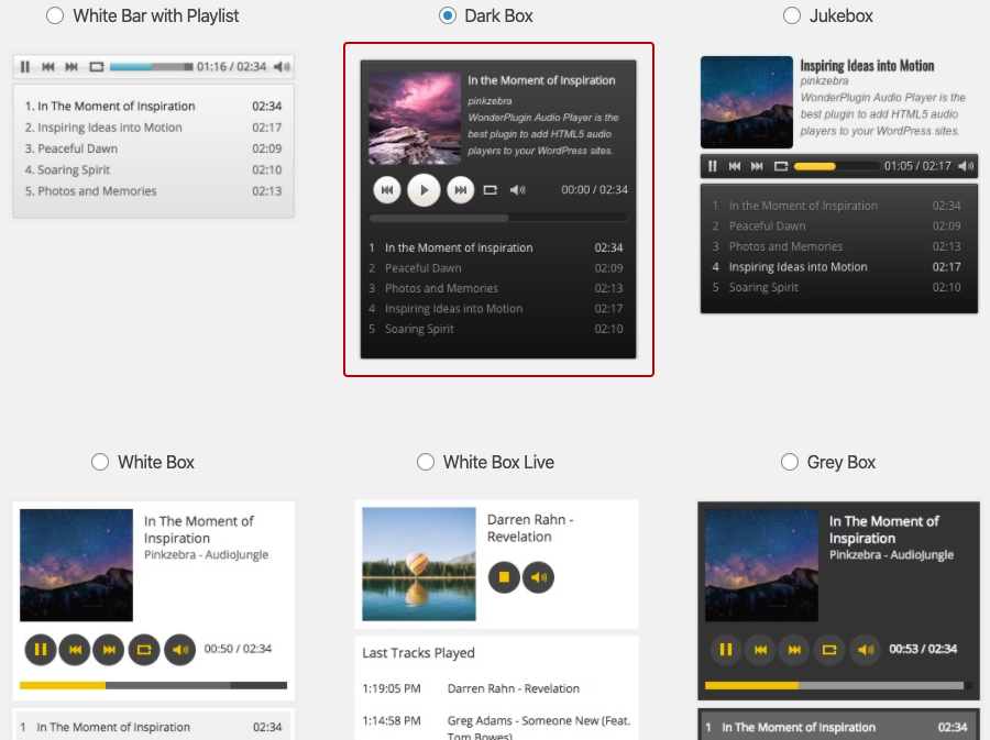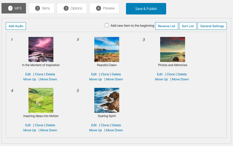 First please install the WordPress premium plugin Wonder Audio Player. You can download the free trial version from the plugin home page, test it, make sure it works for you before upgrading to the commercial version. The trial version has a limit of three audios in one player, the commercial version will remove the limit.