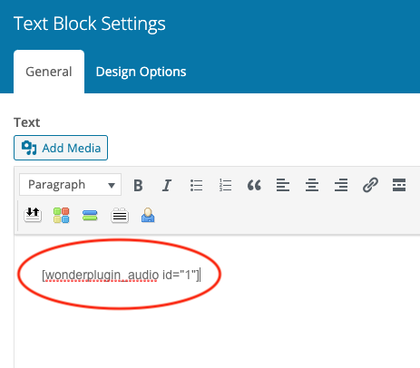 Edit the Text Block, add the player shortcode.