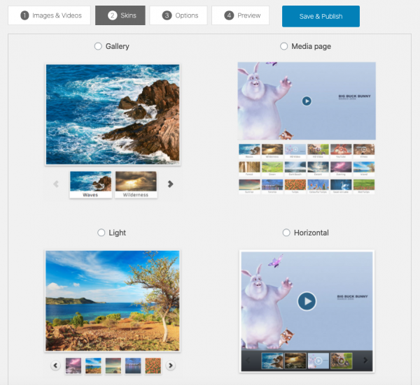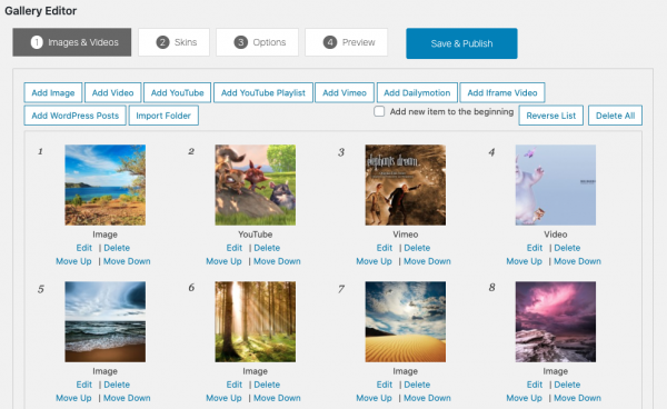 In the plugin, Step 1 Images & Videos tab, you can add images, HTML5 videos, YouTube videos, Vimeo videos, YouTube playlist and WordPress posts. You can also import images and videos from a folder in your WordPress site.
