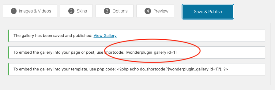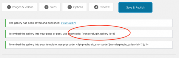 Save and publish the gallery, the plugin will create the gallery and display its shortcode.