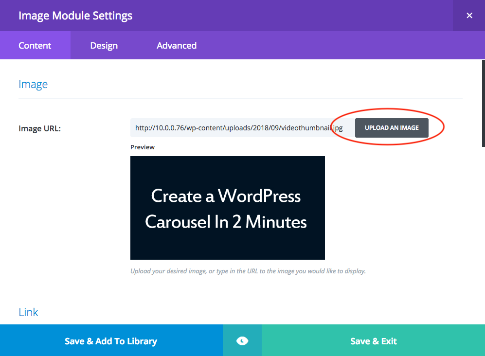 In Divi Builder, add an Image module. In Image Module Settings dialog, Content tab, upload an image.