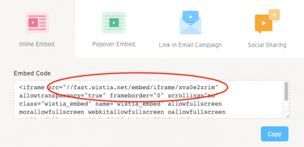 - For Wistia video, log into your Wistia account, edit the video, click the button Video Actions, then click Embed & Share from the drop-down menu. In the popup, copy the src value from the Inline Embed code and add it to the plugin. The URL looks like //fast.wistia.net/embed/iframe/xva0e2zrim.