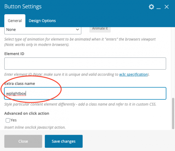 To enable the lightbox effect for the button, in Button Settings, enter wplightbox to the Extra class name input box, then save changes and update the page.